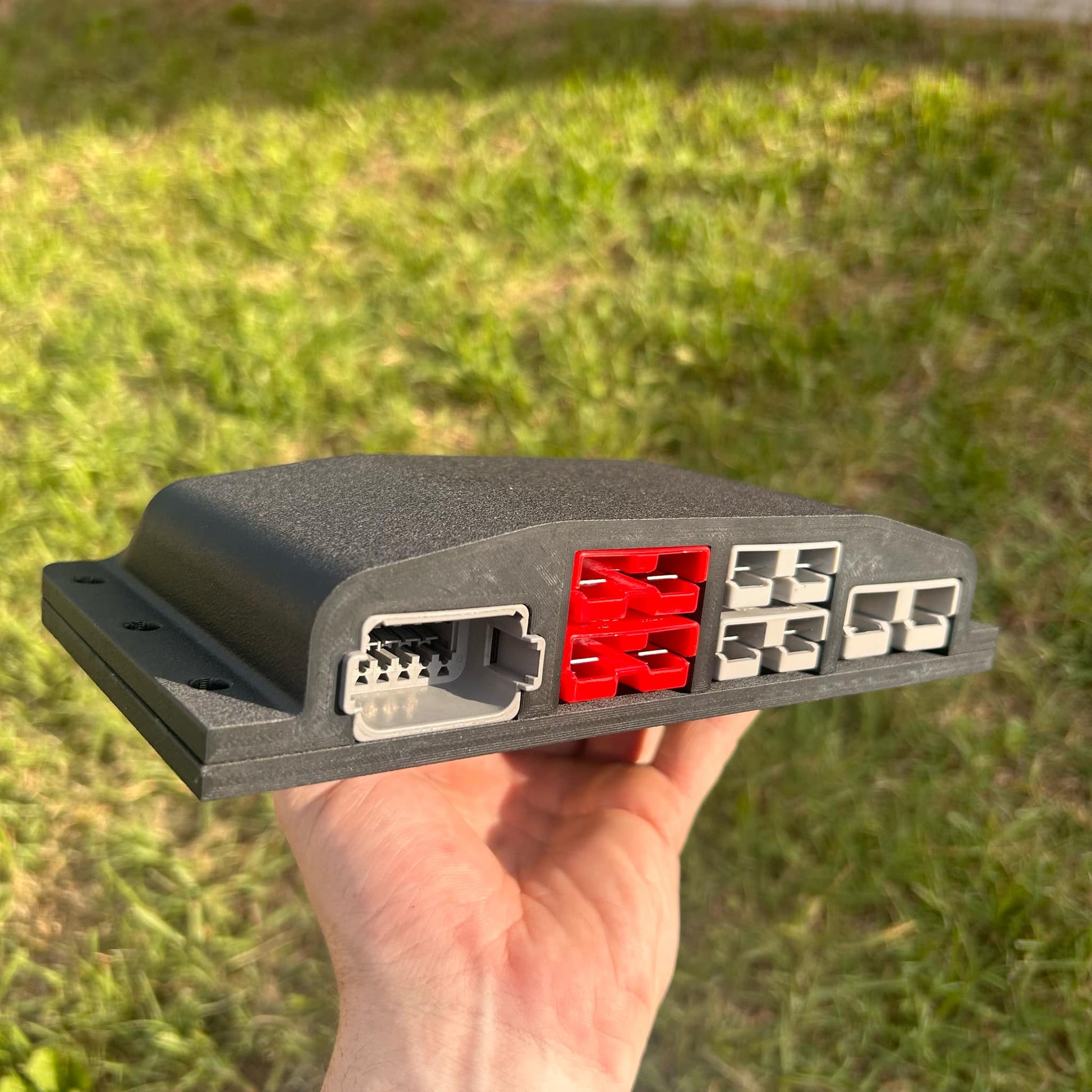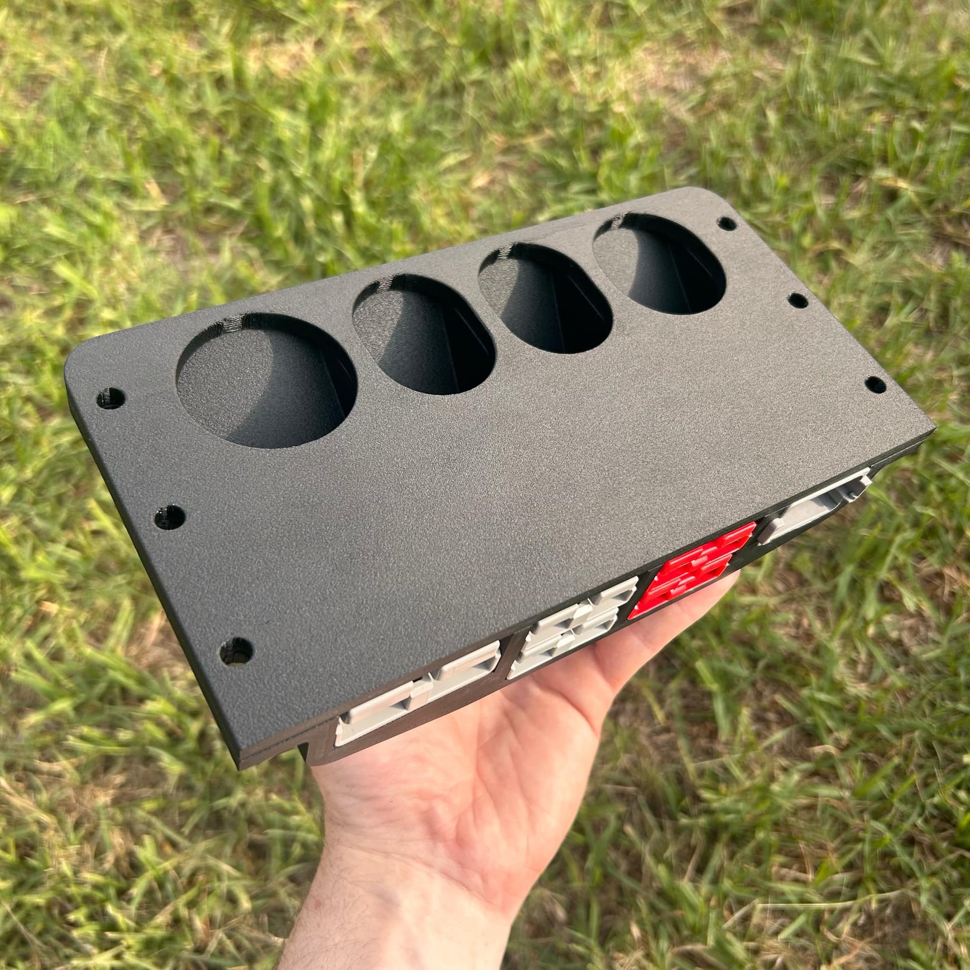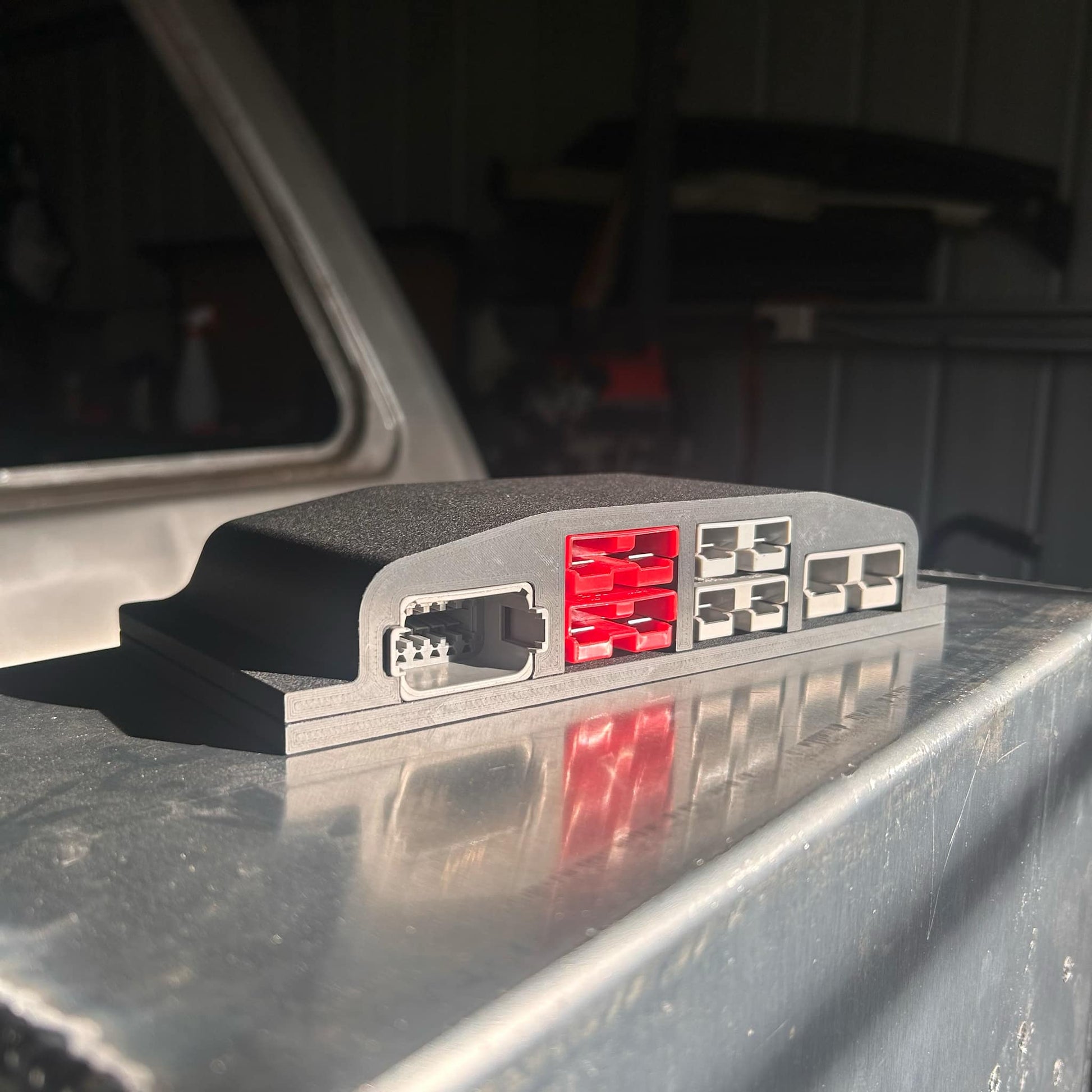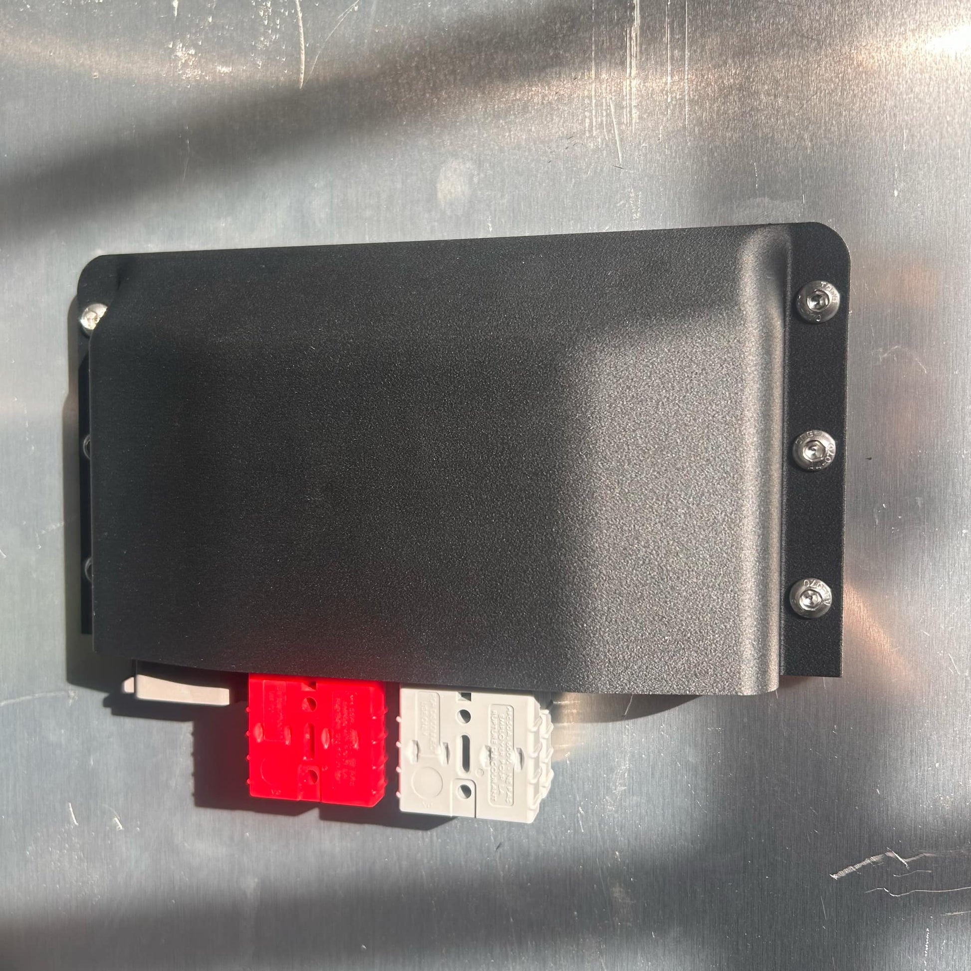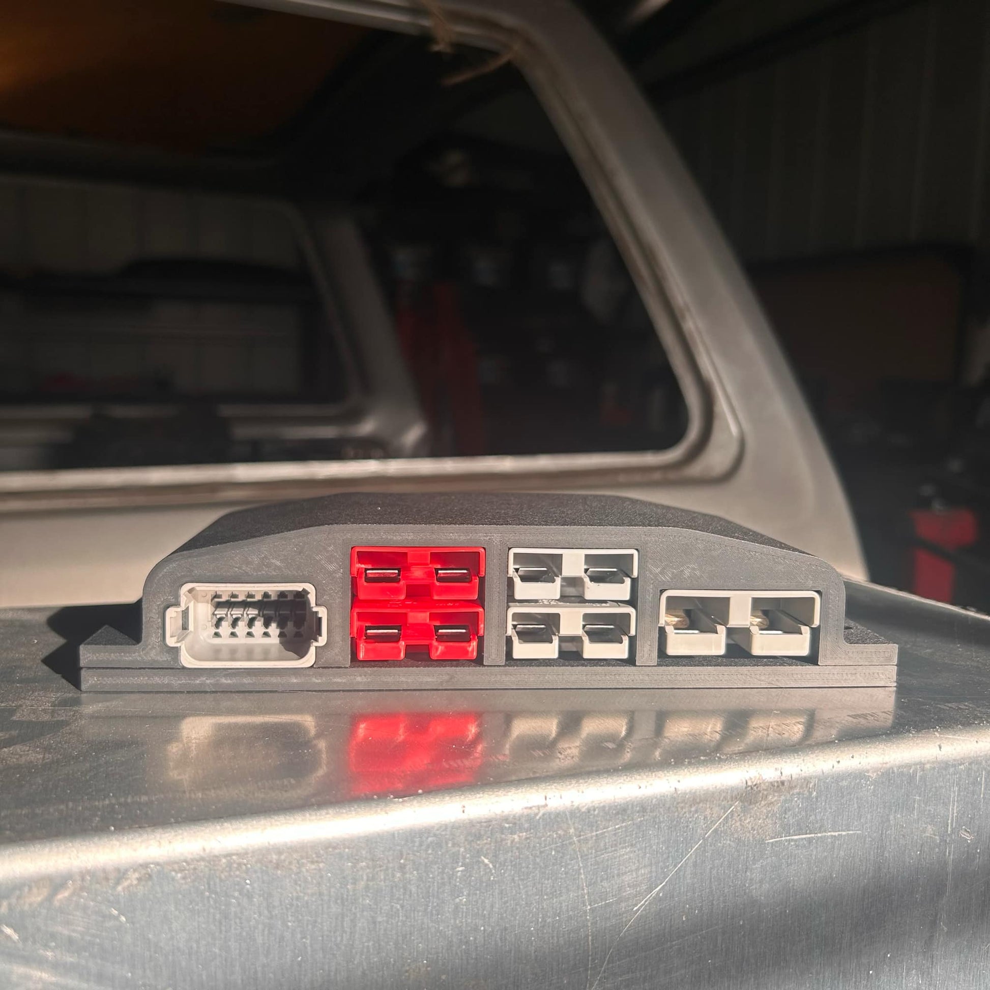 This mount utilizes 4x 50amp Anderson for multiple solar inputs (blankets and or panels) power out to your rooftop and one extra for a spare. A 125amp anderson to run power to your canopy from the engine bay and a 12 pin to run central locking, lights, pumps and any other accessory needed to run your set-up!